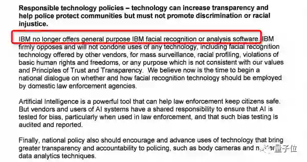 IBM 的这封信,是一个议政属性较强的信件。它除了谈到对相关技术的措施和态度,还呼吁国会通过相应的议案和政策来推动警务透明、人员就业等问题。