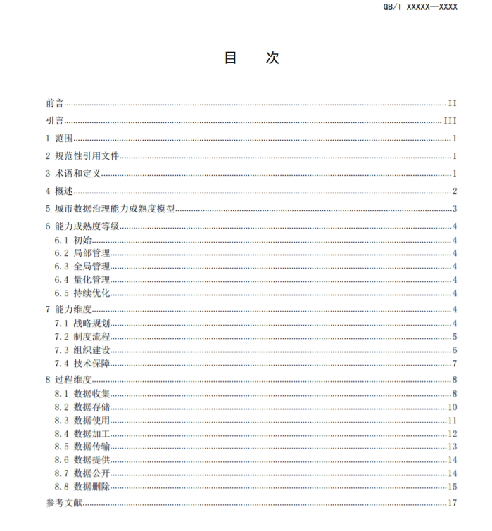 本标准从能力成熟度、能力、过程等三个维度给出了城市数据治理能力成熟度模型。本标准适用于城市数据治理需求方和运营者建立数据治理体系,也可用于对城市数据治理成熟度进行评估。本标准从能力维度和过程维度对城市数据治理能力进行分级。能力域分为数据规划、制度流程、组织建设和技术保障。过程域分为数据收集、数据存储、数据使用、数据加工、数据传输、数据提供、数据公开、数据删除。
