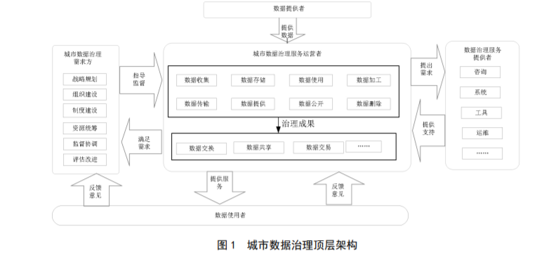 城市数据治理是对城市发展有价值的信息进行识别、归集和组织,建立管理、服务和运营体系,围绕质量、安全、价值等开展数据管理和技术、风险控制的活动。城市数据治理的特点是数据来源多样、网络环境复杂、利益相关方众多、应用场景不断涌现等。城市级别的数据治理需要管理和技术相结合,实现规划、制度、流程、标准等在城市内各组织数据治理工作中的一致性,保证各组织数据治理工作的协调性。城市数据治理中涉及的角色、各角色在城市数据治理中的职责以及角色间的关系如图1所示。