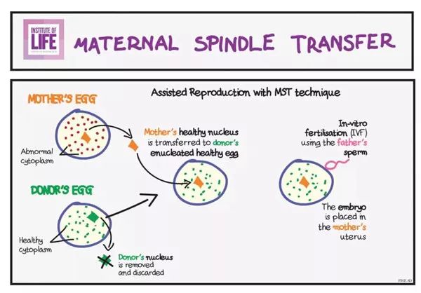 母系纺锤体移植术(maternal spindle transfer),即把母亲卵细胞的细胞核植入捐献者已被清除细胞核的卵细胞中,再进行受精。