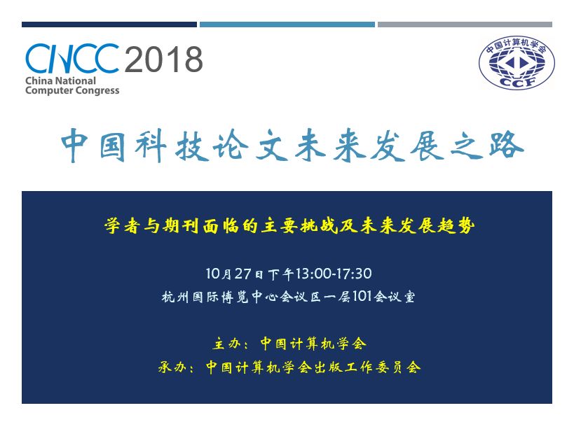 CCF出版工作委员会将在2018年10月27日,在杭州举行的2018中国计算机大会(CNCC2018)期间,举行“中国科技论文未来发展之路”论坛,探讨学者与期刊面临的主要挑战及未来发展趋势。