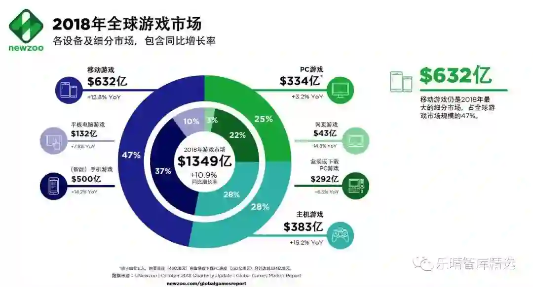 据市场情报研究机构Newzoo公布的最新全球游戏市场数据报告,预测2018年全球移动游戏市场的规模将达到632亿美元(同比增长12.8%),移动游戏仍将是2018年最大的细分市场,占全球游戏市场规模的47%;Newzoo预测2018年中国移动游戏市场将达到194亿美元,同比增长10.6%;2018年全球电竞市场收入预计将达到9.056亿美元,到2021年,这项数据将有可能增长至16.5亿美元。