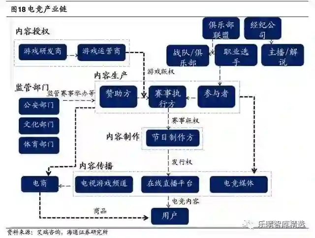 移动电竞产业链在内容上与移动游戏的产业链略有不同,由于加入了电竞赛事运营和职业选手俱乐部的因素,同时考虑到移动电竞的观众并不一定都是游戏玩家,所以也需要借助相应的直播平台与赛事媒体进行内容的传播,所以从产业链的形式上来看更接近于NBA、足球欧洲冠军联赛等传统职业体育赛事。