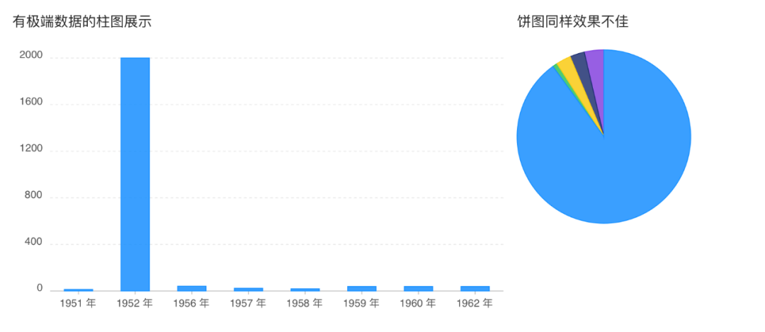 极端数据指一种样本数据极端分布不均匀的情况,比如“100条某产品的销量分布,1条记录10W,其余99条记录在0~1000之间,“如实”反应数据的图表将很难看出**大部分样本数据的特征信息**。需要结合业务场景,做应对处理(比如剔除&“矮化”极端数据,并做对应的文本解释)