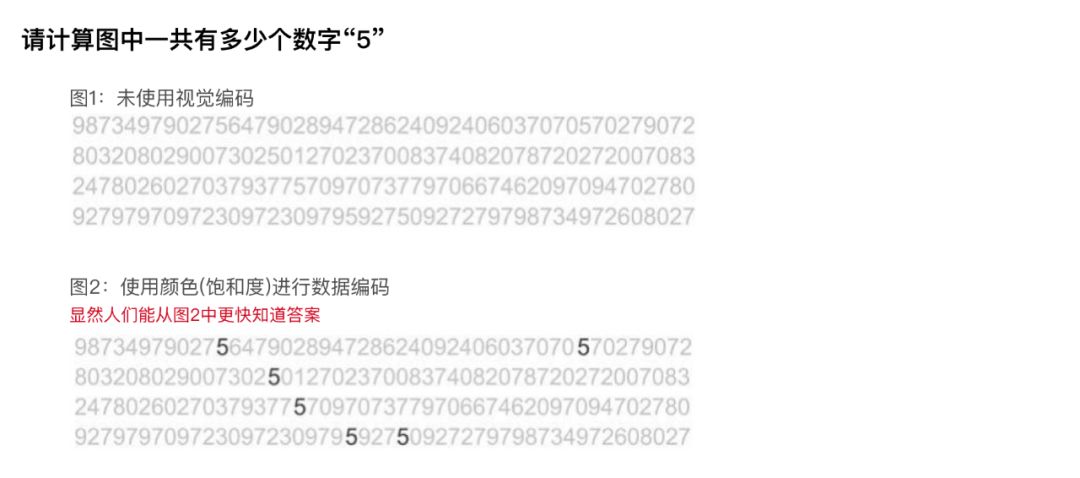 这种心理学现象,叠加颜色色调的处理,很容易促成视觉突出,使我们能够快速注意到被处理的目标数据。上文视觉编码数“5”的举例,便是相似原则的一个案例。