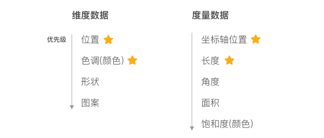 维度和度量所适用的视觉通道是有巨大差异的,例如颜色的色调适用于维度,但不适用于度量。选择正确的视觉通道,令信息传达更有效率。