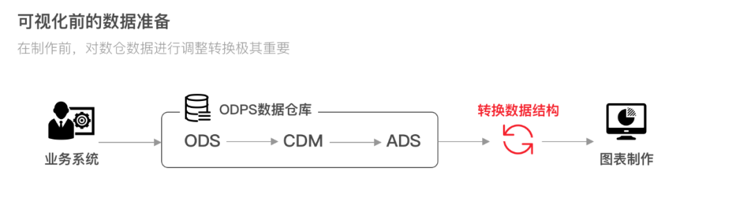 一般来讲,制作数据图表前,或多或少有一系列数据的采集加工环节,以集团开发同学熟悉的ODPS为例,简单来讲如下图流程所示: