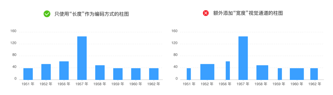我们结合柱形图做一个举例,下图的柱图使用了宽度(size)映射了一个度量字段数据,宽度影响了长度的有效力,这两个通道的同时使用,使得感知上有趋近面积这一通道,从而影响了整体图表的效果。