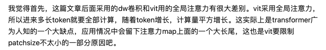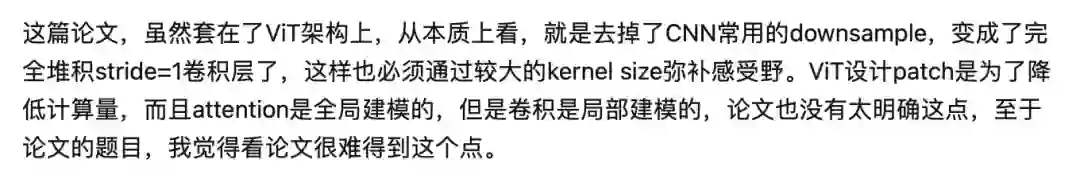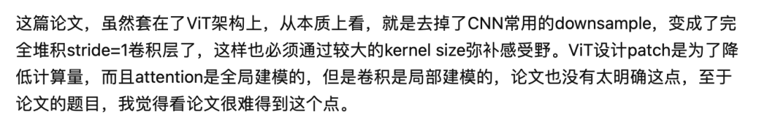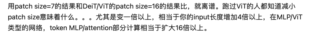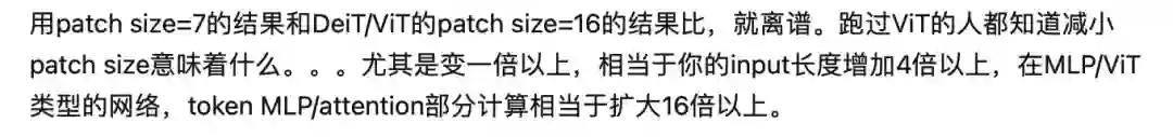 此外,也回答了之前一位网友指出的问题:「这篇论文减小patchsize,相当于增大输入token size,与vit等方法是不公平的比较。同时这篇文章的方法实际运行速度慢(throughput)。」