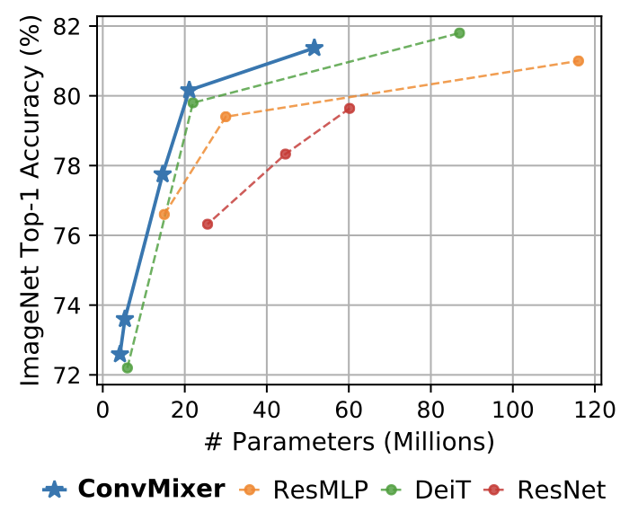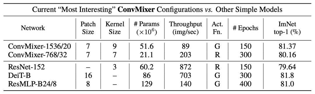此外,ConvMixer-768/32使用的参数仅为ResNet-152的三分之一,但其准确度与之类似。