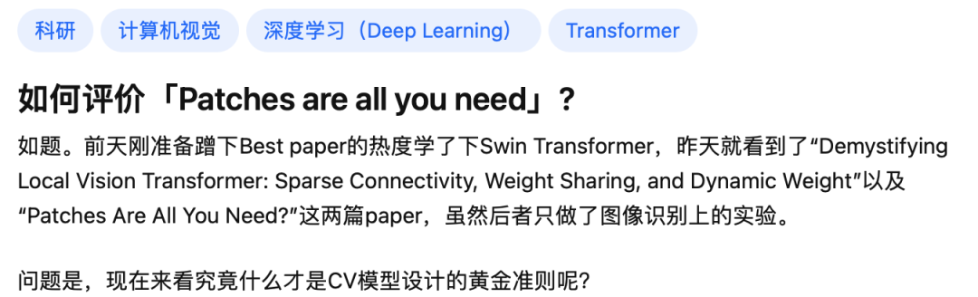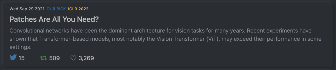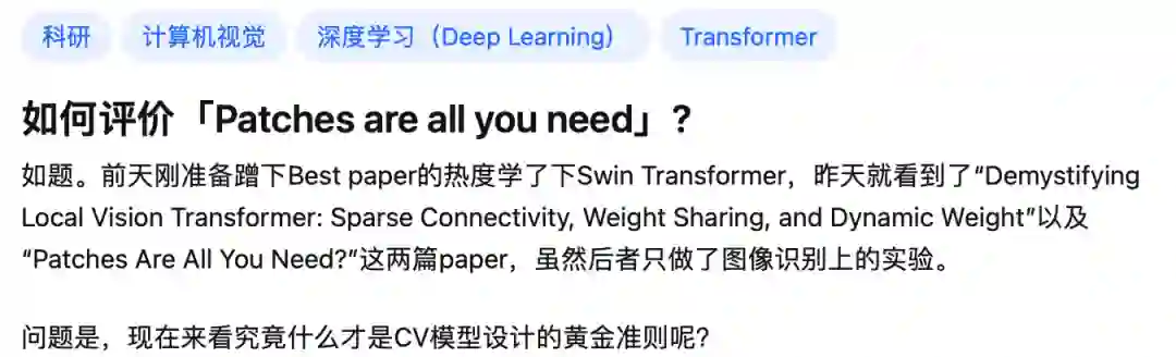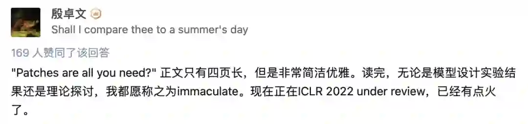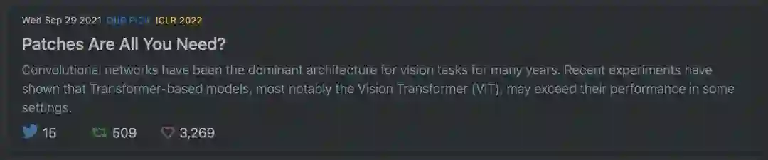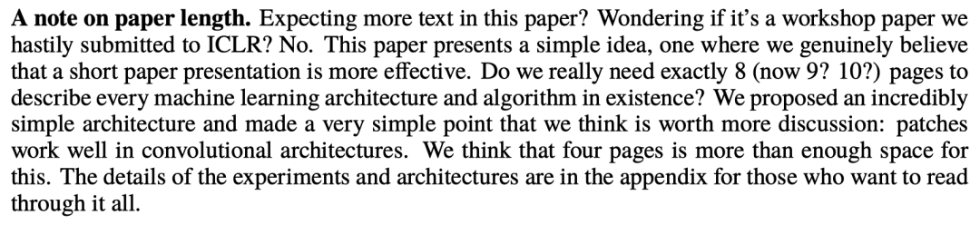 此外,作者还特地在文末写了个100多字的小论文表示:「期待更多内容?并没有。我们提出了一个非常简单的架构和观点:patches在卷积架构中很好用。四页的篇幅已经足够了。」