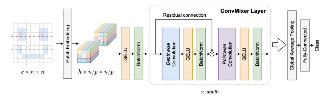 ConvMixer由一个patch嵌入层和一个简单的完全卷积块的重复应用组成。