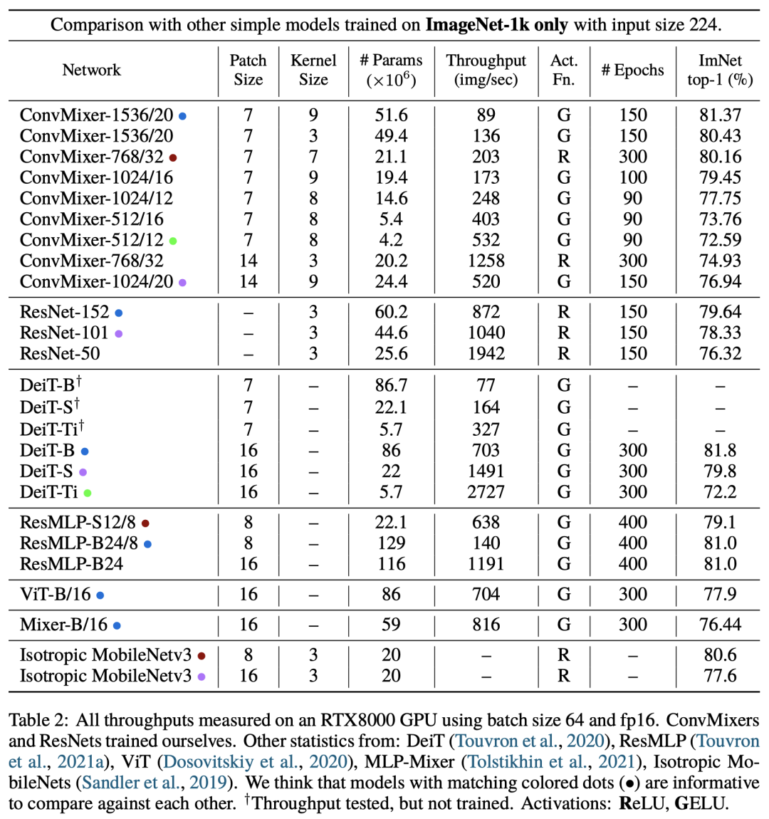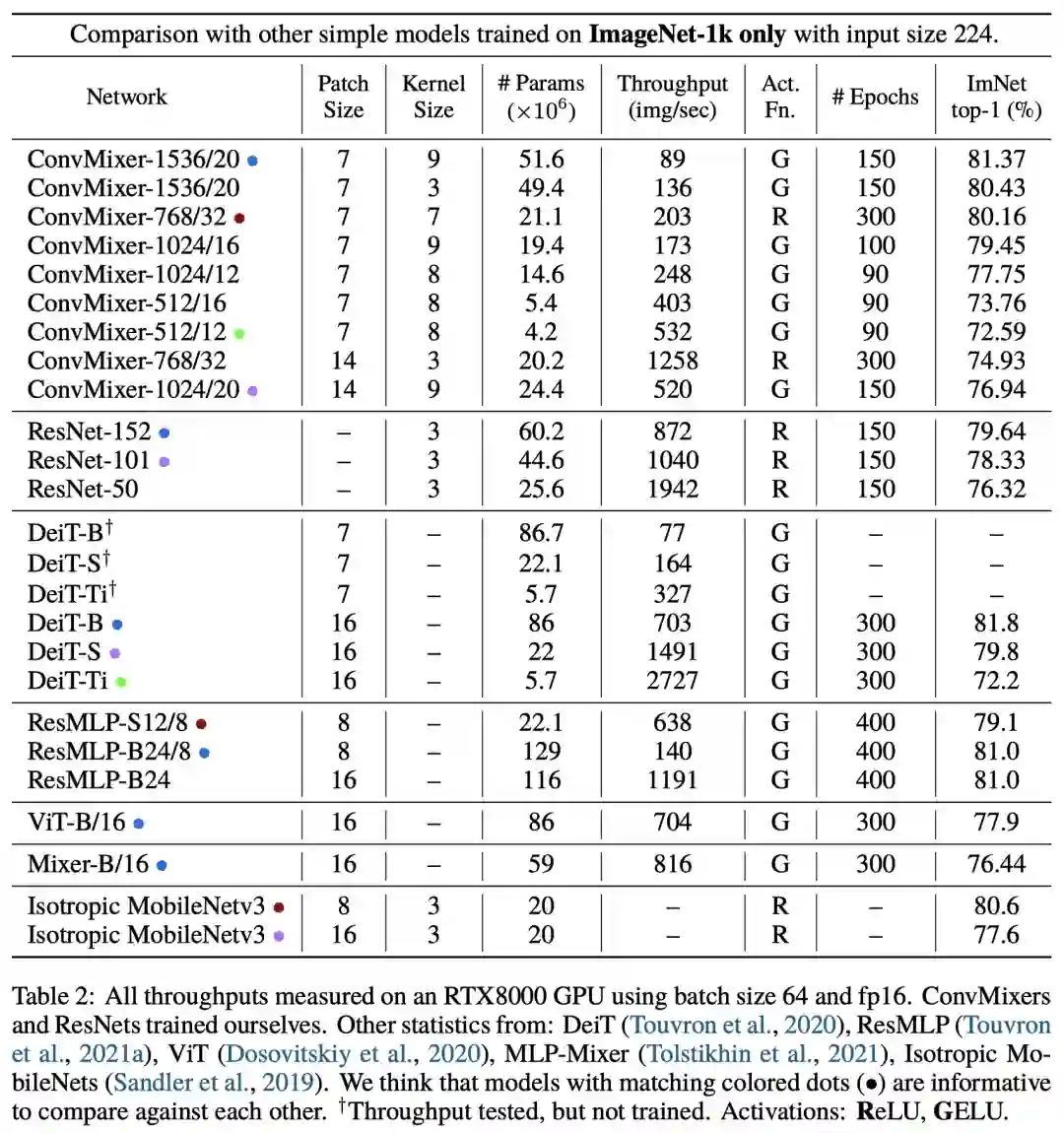 ConvMixer-1536/20的性能优于ResNet-152和ResMLP-B24,而且参数要少得多,并且与DeiT-B的性能接近。