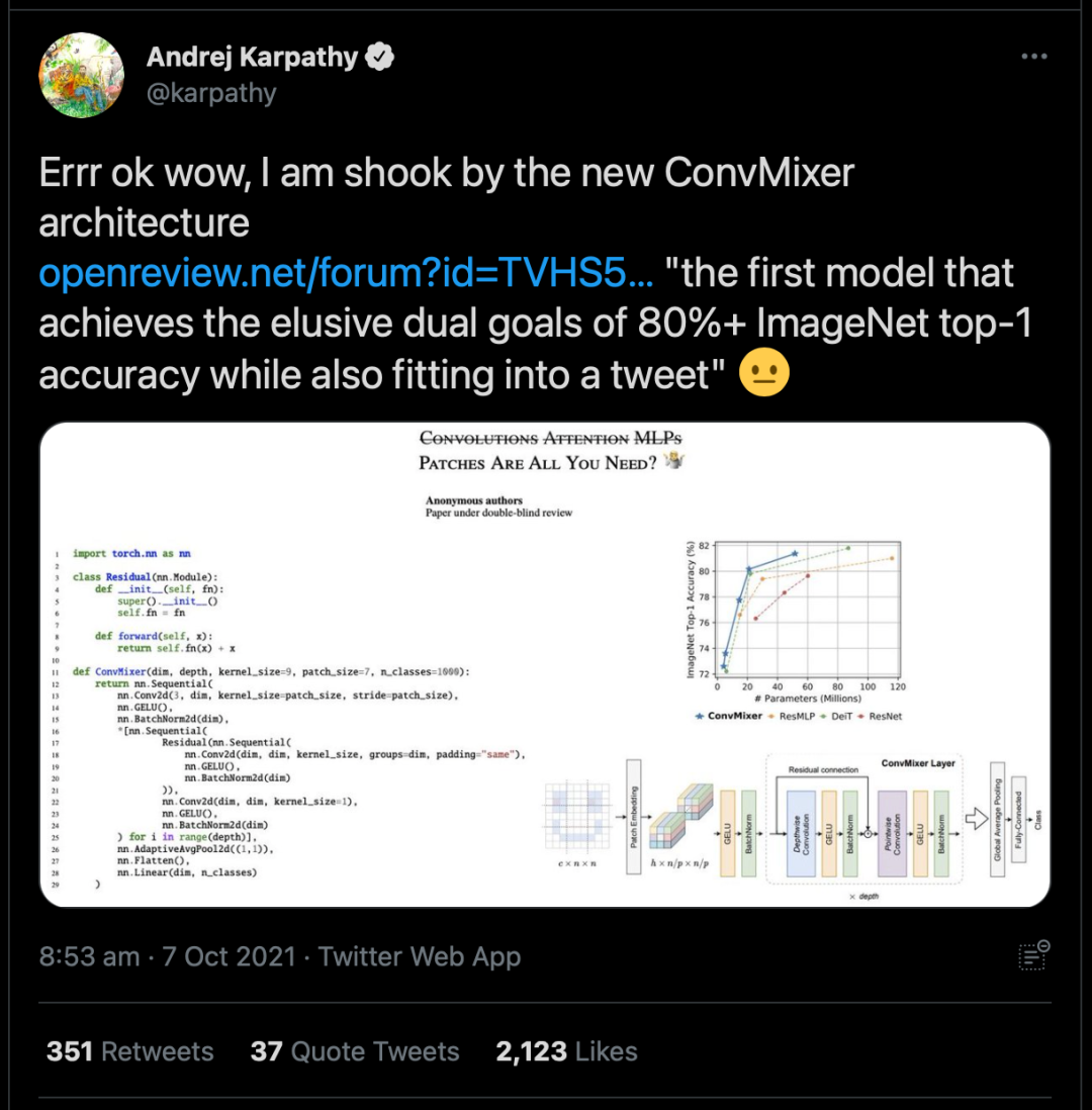 特斯拉AI高级总监Andrej Karpathy也赞叹道:「我被新的 ConvMixer 架构震撼了。」