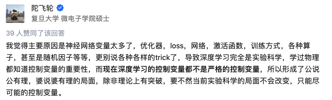 对于网上这些争论,@陀飞轮表示,主要是「深度学习的控制变量都不是严格的控制变量」这个问题所造成的。