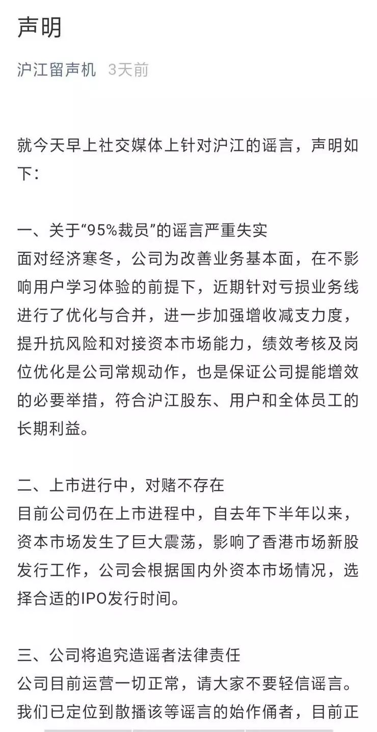今年3月6日,沪江教育被传出上市对赌协议失败,导致大范围内的裁员,比例大约为95%。爆料称沪江市场部、督导和老师全部下岗。随后,沪江教育发出公告称,公司仍然上市进程中,不存在对赌。面对国内外资本市场变化,沪江将选择合适时机进行IPO。公司确实正在对部分业务线调整优化,以增收减支。