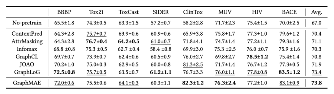实验结果如表 3 所示,GraphMAE 在迁移学习任务上的表现与基线相当(comparable)。其中,GraphMAE 取得了最好的平均分数,且在 2 个数据集中比基线的最佳结果有小的提升。这证明了 GraphMAE 强大的可迁移性。![]()