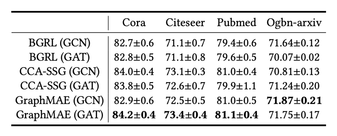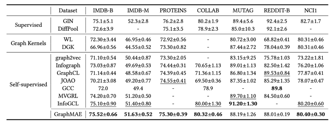 实验结果如表 1 所示,与 SOTA 的自监督模型相比,GraphMAE 在所有的数据集上都取得了最好或相当的(comparable)表现,且 GraphMAE 的表现大大超过了现有的生成性自监督模型。