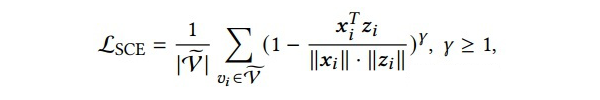 此外,为了训练的稳定,GraphMAE 采用可缩放的余弦误差(scaled cosine error)作为特征重建好坏的标准。