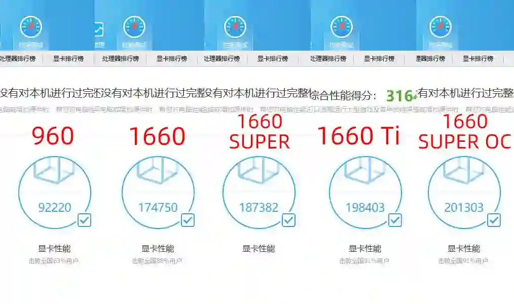 通过 GPU-Z 能识别到 1660Super 大部分的关键性能参数,三张卡统一采用 441.07 测试驱动进行测试,在 1080P 的测试下我还加入了一张 GTX 960,给老显卡用户当作性能参考,以及加入 1660Super 超频后的性能表现,首先先来看看国民测试软件鲁大师的显卡得分。