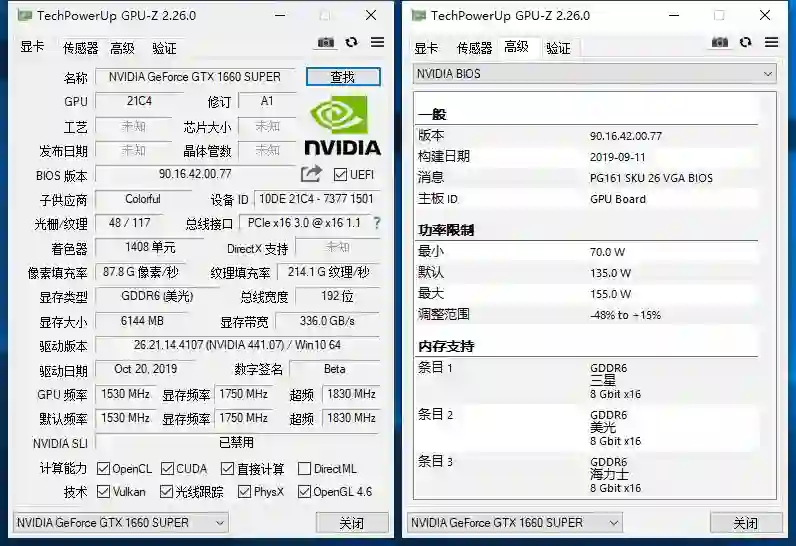 从上图可以看出,iGame GeForce GTX 1660 SUPER Ultra 6G采用“TU116”图灵 GPU,CUDA 内核以及纹理贴图单元与 1660 数量相同,但显存升级到了 GDDR6 显存,带来了比 1660Ti 更高的 14Gbps 显存速率,出厂核心频率也比 1660Ti 有所提高,在七彩虹的一键超频状态下的核心频率 Boost 频率分别为 1530MHz/1830MHz。