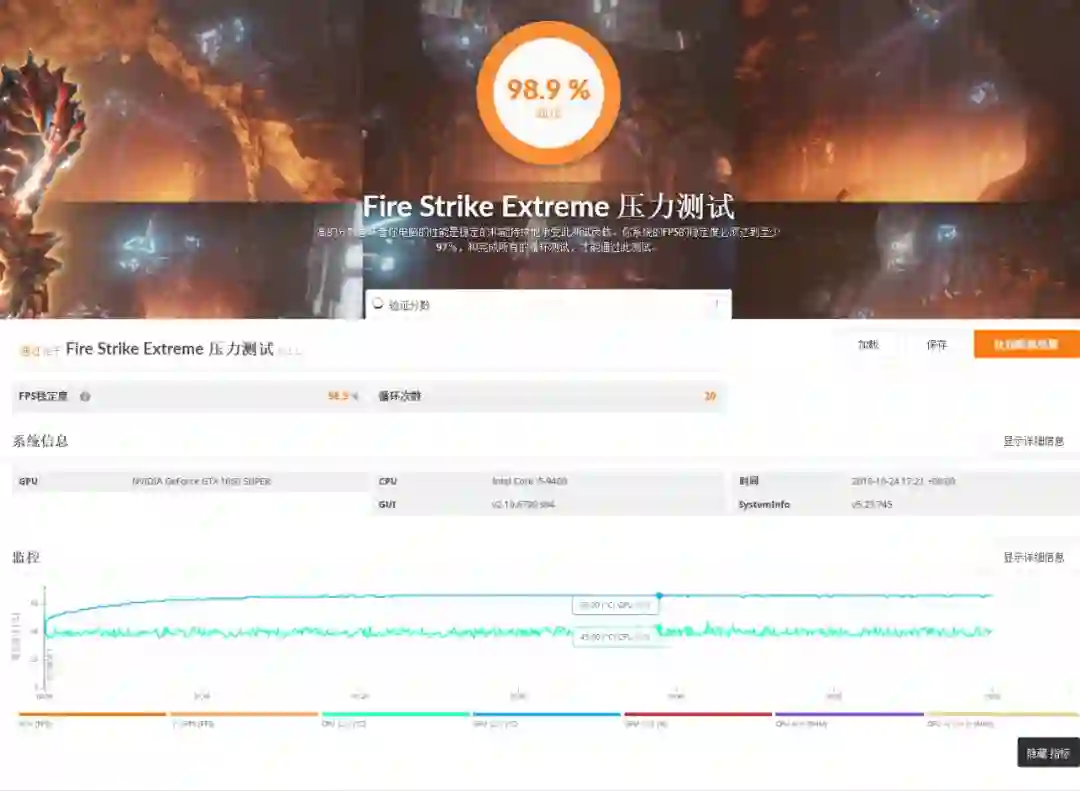 通过 FSE 长时间的压力测试,iGame GTX 1660 SUPER Ultra 最高温度维持在了 66度,得到了 98.9% 的稳定得分,同时整机输出功耗平均在 250W 左右。