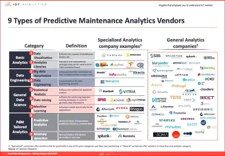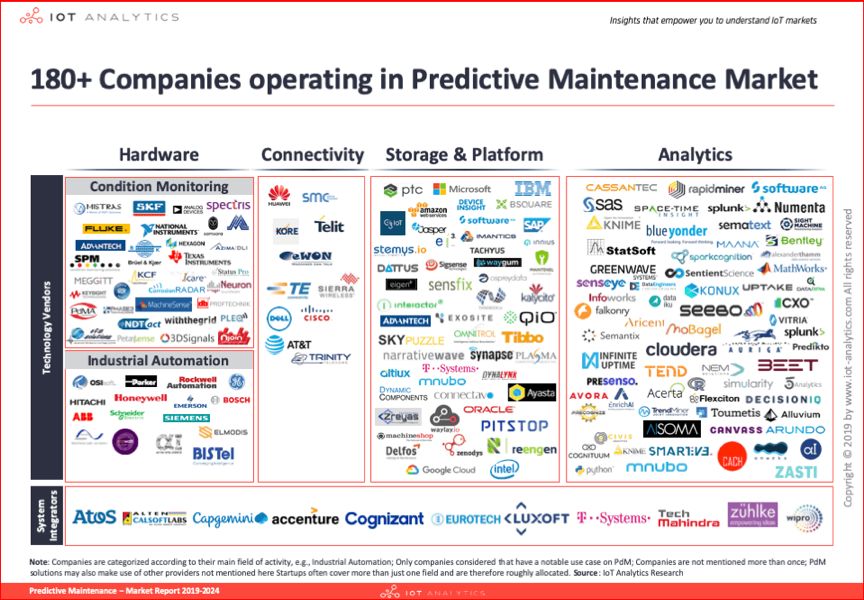 对于这180多家预测性维护市场的技术供应商和系统集成商,IoT Analytics将其分成四个主要类型: