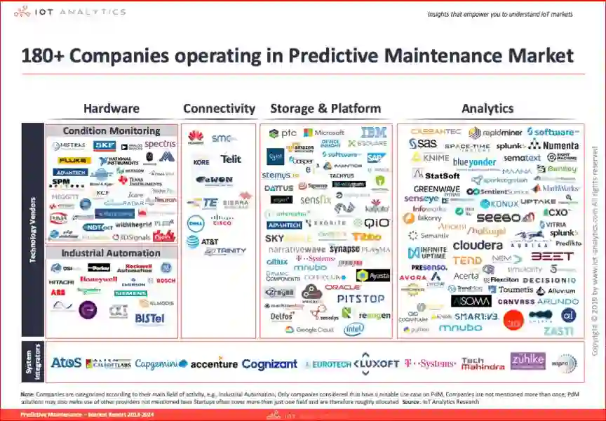 另据赛迪顾问数据显示,以预测性维护为代表的工业大数据市场前景广阔。从全球来看,去年工业大数据市场规模破百亿美元,年增速超30%。巨大的市场前景不断刺激企业进入预测性维护市场“捞金”,为了详尽研究预测性维护市场现状,IoT Analytics盘点了一批有计划进入预测性维护市场的企业。