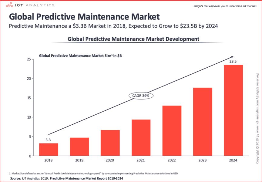 在《2019-2024年预测维护市场报告》中,IoT Analytics公司预计,2018年全球预测维护市场规模达33亿美元,预计到2024年,其复合年增长率将超过39%,达到235亿美元。