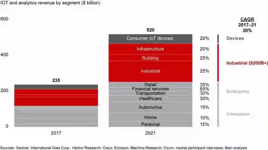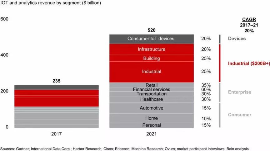 综合Gartner、IDC、Machina Research、思科、贝恩等多方分析数据来看,工业物联网在整个IoT领域势必会占到很大的份额,到2021年整个市场规模有望翻番,达到2000亿美元。