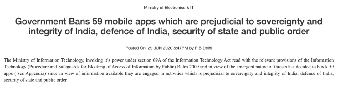 信息技术部援引《信息技术法》第69A条,参照《2009年信息技术规则》有关规定,鉴于受威胁的紧急性质,决定封锁59个应用程序。它们从事的活动有损于印度的主权完整、印度国防安全和公共秩序的安全。