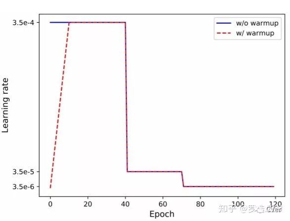 Warmup学习率并不是一个新颖的东西, 在很多task上面都被证明是有效的,在我们之前的工作[1]中也有过验证。标准Baseline使用是的常见阶梯下降型学习率,初始学习率为3.5e-4,总共训,120个epoch,在第40和70个epoch进行学习率下降。用一个很大的学习率初始化网路可能使得网络震荡到一个次优空间,因为网络初期的梯度是很大的。Warmup的策略就是初期用一个逐渐递增的学习率去初始化网络,渐渐初始化到一个更优的搜索空间。本文使用最简单的线性策略,即前10个epoch学习从0逐渐增加到初始学习率。