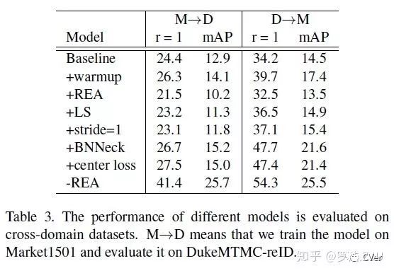 为了观察这些trick是在训练域上overfit了,还是真正的增加了网络的泛化能力,我们还做了cross domain的实验。即在一个数据集上训,在另外一个数据集上测。结果显示REA会大大的降低跨域的性能,其他的trick都还是有一定程度的涨点的。最后我们删除REA,只使用其他五个trick,M→D的结果达到了41.4的rank1。目前M→D的SOTA方法也就50左右的水平,这已经是个不错的Baseline了。当然也值得深思,为什么REA数据增广会降低跨域性能。