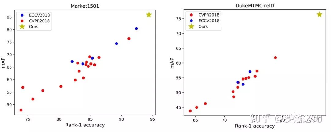 近一年顶会上ReID工作Baseline性能的统计。左图为Market1501数据集,右图为DukeMTMC-reID数据集。