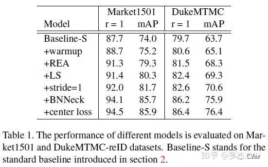 通过引入前文的各种trick,我们的Modified Baseline就如上图所示。输入的图像经过REA数据增广,然后经过ResNet50网络,last stride改为1。然后经过BNNeck,由于center loss也是一种metric loss,所以和triplet loss一起放到BN前面。最后分类损失结合LS一起计算。整个网络使用warm up学习率去优化。