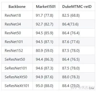 在我们开源了代码之后,有好心人帮我们扩展了Backbone,包括ResNet、SENet、SeResNet等等。大致结果呈现网络越深,效果越好,这也符合正常的结论。其中SeResNeXt101取得了95%的rank1和88%的mAP,基本已经相当高了。ResNet152在Market1501上有点反人类,可能是数据集太小,并且比较简单,所以overfit了吧。