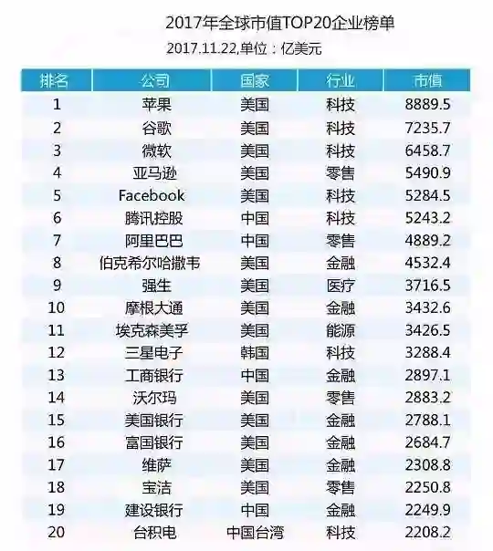 2017年秋天,随着腾讯和阿里巴巴两家中国公司市值的不断上涨,全球市值头部公司刚好是七大科技巨头(下图前7个公司)。