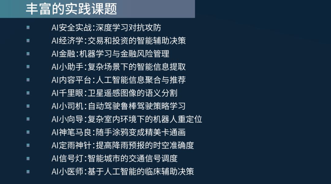 实践课题覆盖六大代表性应用行业:AI+金融、AI+零售、AI+医疗健康、AI+移动互联网、AI+教育、AI+公益,和 600 名学员一起共同展望 AI 的广阔发展前景。