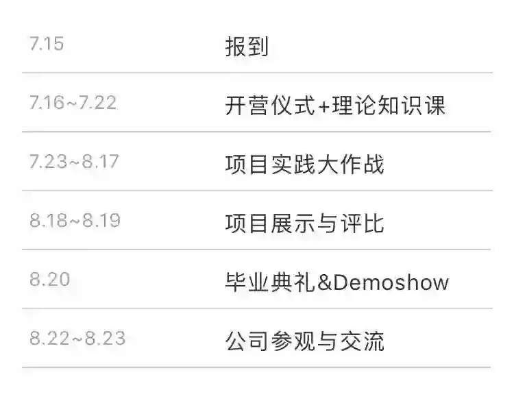 训练营时间为 2019 年 7 月 15 日 - 8 月 23 日,共 5 周,流程安排如下: