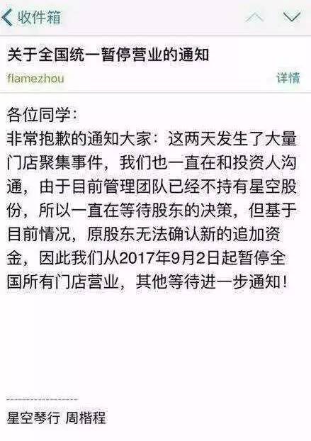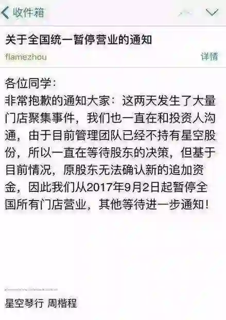 9月2日,星空琴行关闭了全国多家门店。CEO周楷程在内部邮件中表示:“目前管理团队已经不持有星空股份,所以一直在等待股东的决策,但基于目前的情况,原股东无法确认新的追加资金。因此我们从2017年9月2日起暂停全国所有门店营业,其他等待进一步通知!”