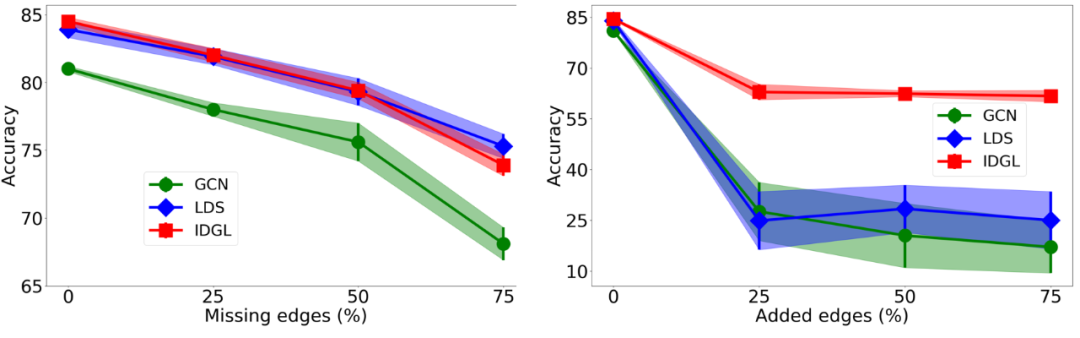 为了验证IDGL模型对于对抗性图攻击的健壮性,研究人员对于初始图结构进行了随机增删边篡改攻击。实验结果表明,相比于GCN和LDS,IDGL由于可以利用基于图节点信息学到的隐含图结构,因而拥有更优的健壮性。