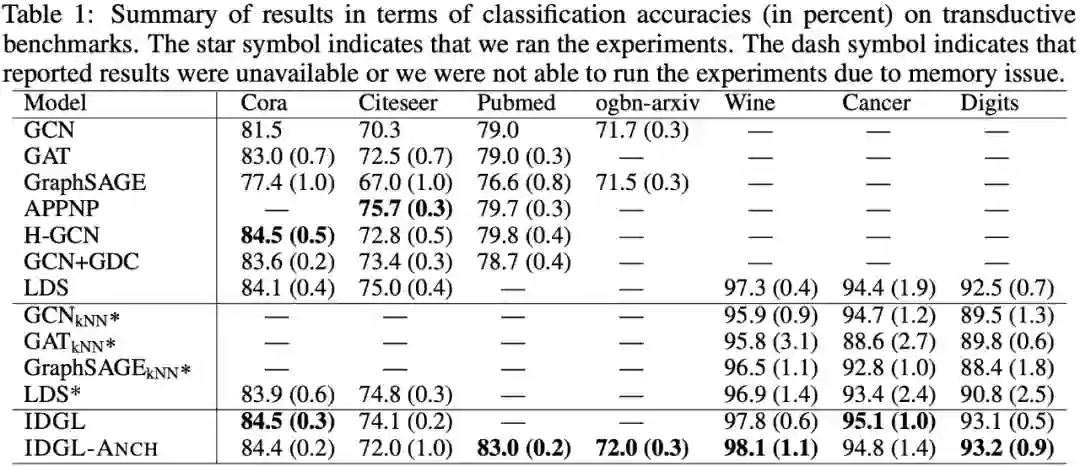 基于IDGL框架,研究团队进而开发出一种基于锚定法 (anchor-based) 的扩展版本IDGL-Anch,将算法的时空复杂度从O(n^2)大大降低到O(n),其中n代表图节点个数。与众多GNN模型和图学习模型相比,本文所提出的模型在9个数据集上取得了最佳或接近最佳的结果。
