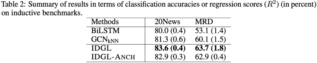 尽管图学习基线模型LDS在直推学习实验中也取得了不错的结果,但是LDS无法进行归纳学习。所谓归纳学习,即测试集中包含训练集中所未见的新图。相比而言,如下表所示,IDGL及IDGL-Anch在归纳学习实验中也取得了优异的结果。