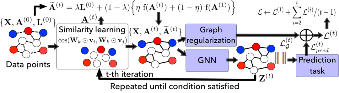 如上图所示,这种图结构和表征的联动学习,交替迭代进行,直到图结构 (或表征) 收敛到某种最优值。而这种联合学习的优化目标是:整体模型在特定下游任务中取得最优的性能。当然,这种迭代式学习过程,通常伴随着一个问题,如何判断何时停止迭代?本文提出了一个有效的动态收敛条件,即当相邻两次迭代中学到的图结构相似度达到一定阈值时,便停止迭代。在原论文中,作者给出了这种收敛存在的条件,并做了实证性分析证明其有效性。