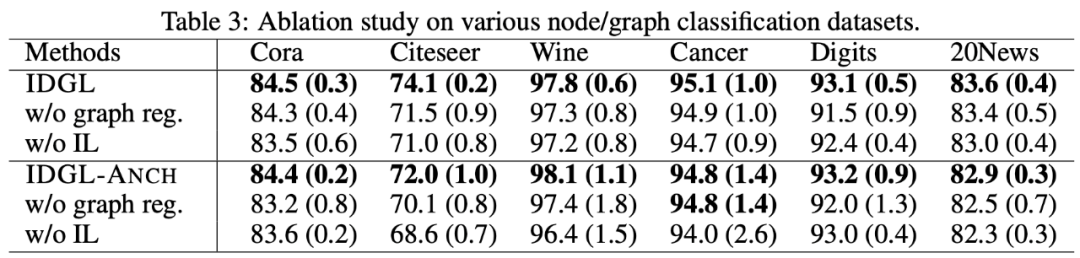下表是在几个数据集上进行的消融实验的结果。可以发现,迭代学习模块 (IL) 及图正则化模块 (graph reg.) 都对整体模型性能起到了重要作用。