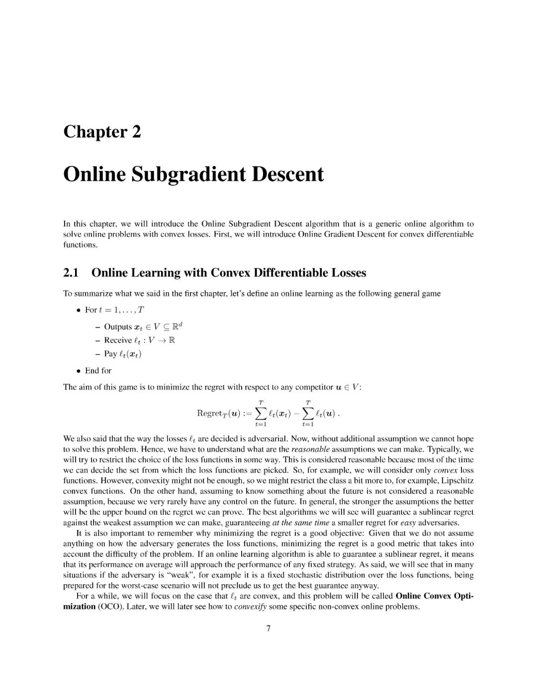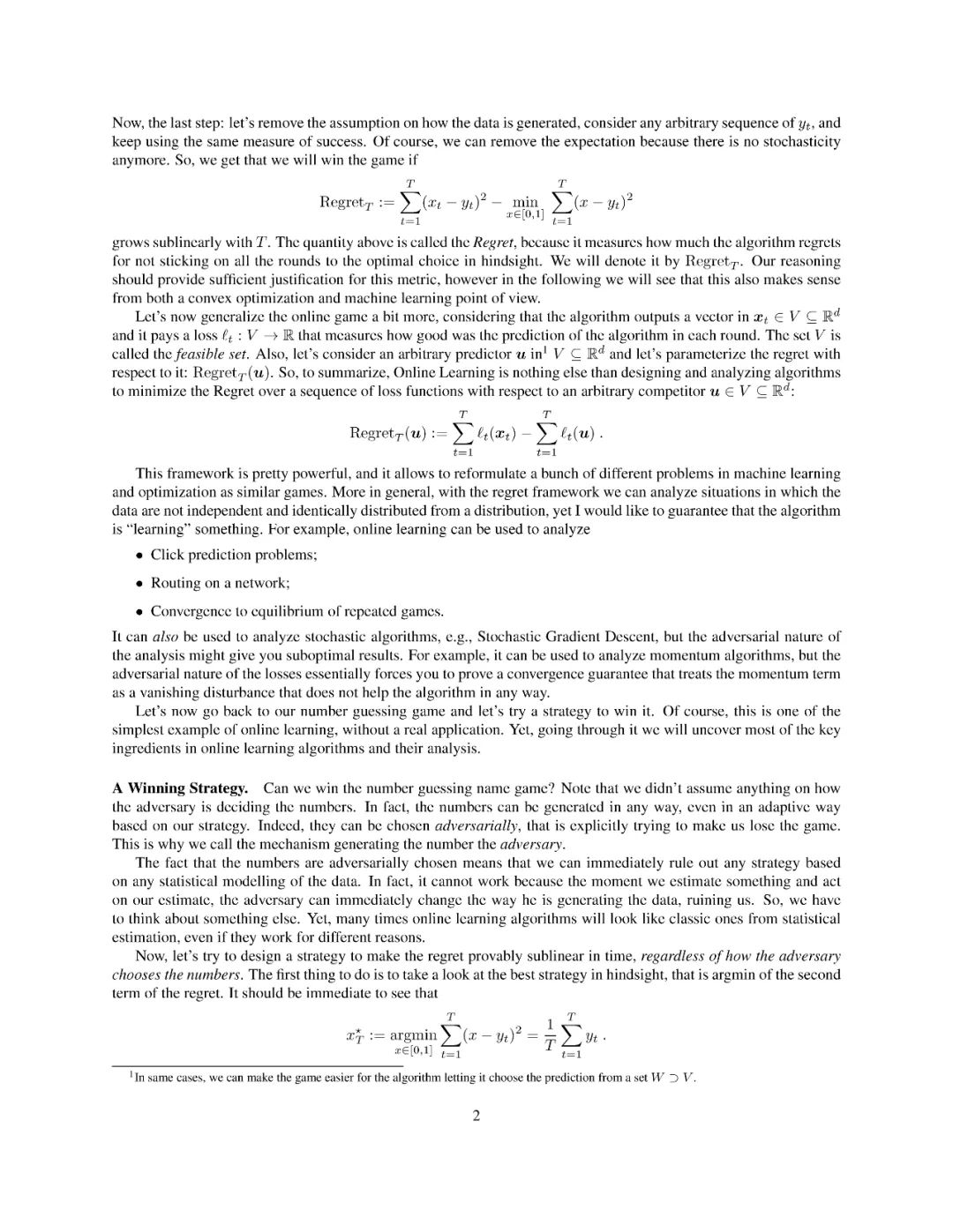 这本专著,我通过在线凸优化的现代视角介绍了在线学习的基本概念。这里,在线学习指的是在最坏情况假设下的后悔最小化框架。我提出了凸损失在线学习的一阶和二阶算法,在欧几里德和非欧几里德设置。所有的算法都清晰地呈现为在线镜像下降或跟随正则化及其变体的实例化。特别关注的是通过自适应和无参数在线学习算法来调整算法的参数和在无界域内学习的问题。非凸损失通过凸替代损失和随机化处理。本文还简要讨论了强盗设置问题,讨论了具有对抗性和随机性的多武装强盗问题。这些笔记不需要凸分析的先验知识,所有必需的数学工具都得到了严格的解释。此外,所有的证明都经过精心挑选,尽可能地简单和简短。