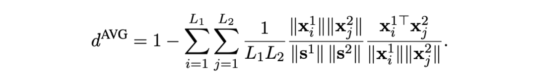 将余弦相似度转换为余弦距离(1-cos),带入平均池化公式,可以转化为关于 token embedding 的距离度量:
