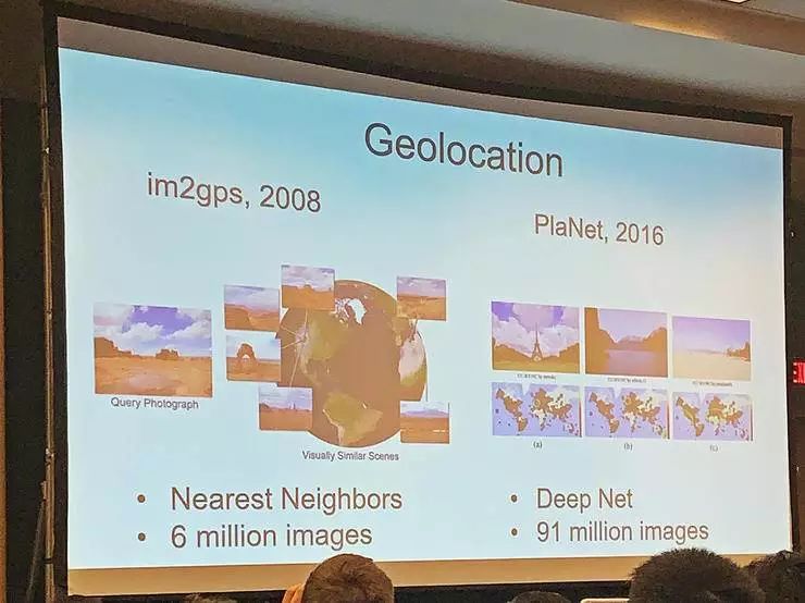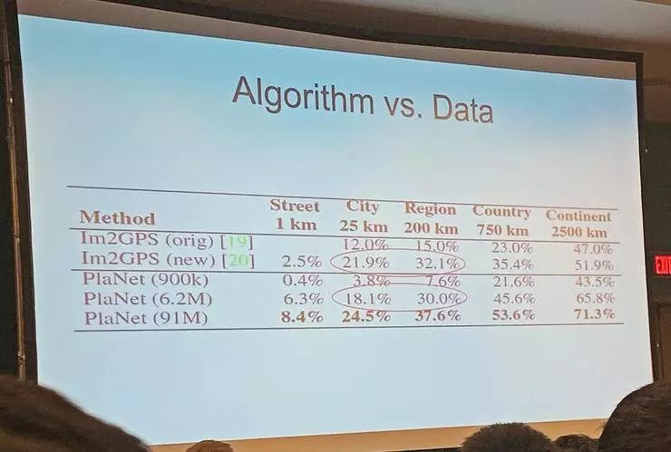 另一个例子是他自己在 2008 年用最近邻算法做了图像的地理位置识别,巧的是谷歌也在 2016 年用深度学习研究了同一个问题。作为后来者的谷歌拿出了更多的数据,所以结果更好。