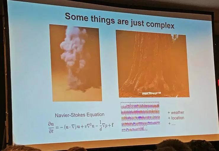 他还举了个例子,一团烟雾的行为可以用公式描述,但是一颗树的生长行为是由温度、光照、水、气候等等许多复杂的因素在很长时间内连续变化所影响的,那么它就是没办法简单地解释的。