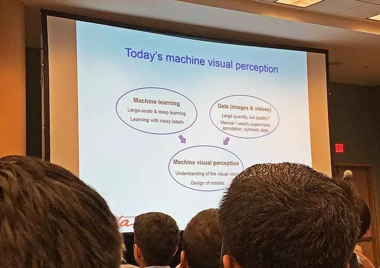 Computer Vision After 5 Years Workshop 的三位组织者来自 UC 伯克利、FAIR 以及 UIUC,邀请到的演讲者包括 Ross Girshick、Jitendra Malik、Alexei Efros 等计算机视觉领域响当当的人物。研讨会在中午休息后开始;开始前五分钟,会议厅内就座无虚席。到了计划开始时间时,容量约 400 人的演讲厅的两侧走道、门内走廊就像 Facebook 何恺明、Ross 组组织的 Visual Recognition and Beyond 教学讲座一样挤满了人,这也说明了研究者们对整个领域大方向的关心。(虽然相比于本届 CVPR 超过 9000 的参会人员来说也算不上是多大的数字)